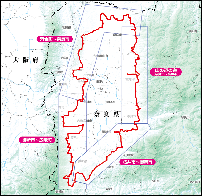 「奈良県では「楽しく、安全に歩ける」をテーマに、奈良盆地をループ状に周遊するウォークルートを設定していきます。まずはじめに、周遊ウォークルートの区間として葛城古道を含む御所市~広陵町を巡るルートと、日本最古の道と言われる、「山の辺の道」の2ルートを設定しました。 今後、他の区間もルートを設定し、このサイトで紹介していきます。 趣のある街並みや神秘的な山々、また古代から連綿と続く奥深い歴史等、奈良でしか味わうことができない歩き旅を楽しんでみませんか。」