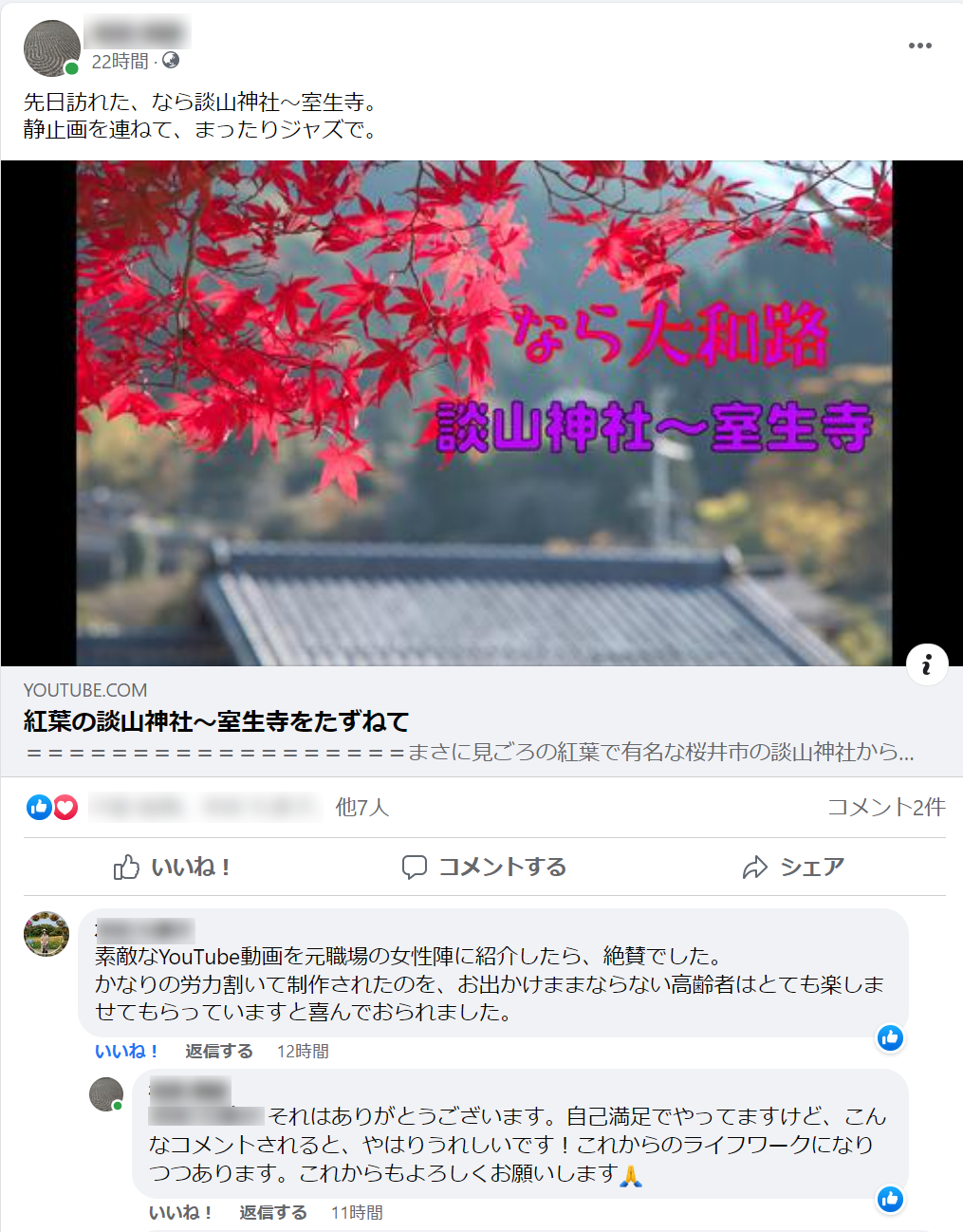 「素敵なYouTube動画を元職場の女性陣に紹介したら、絶賛でした。かなりの労力割いて制作されたのを、お出かけままならない高齢者はとても楽しませてもらっていますと喜んでおられました。」