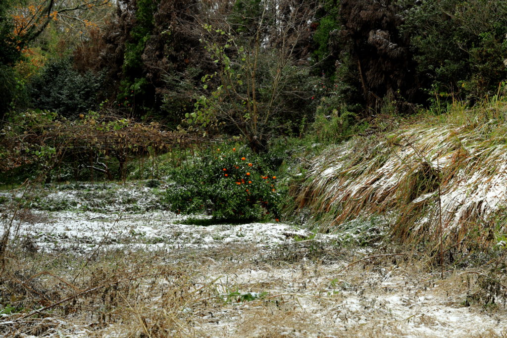 柿の木を撮影するために近くに停めた車付近の少し入りくんだところに、みかんの木。実の色が寒さに反抗しているようだった。