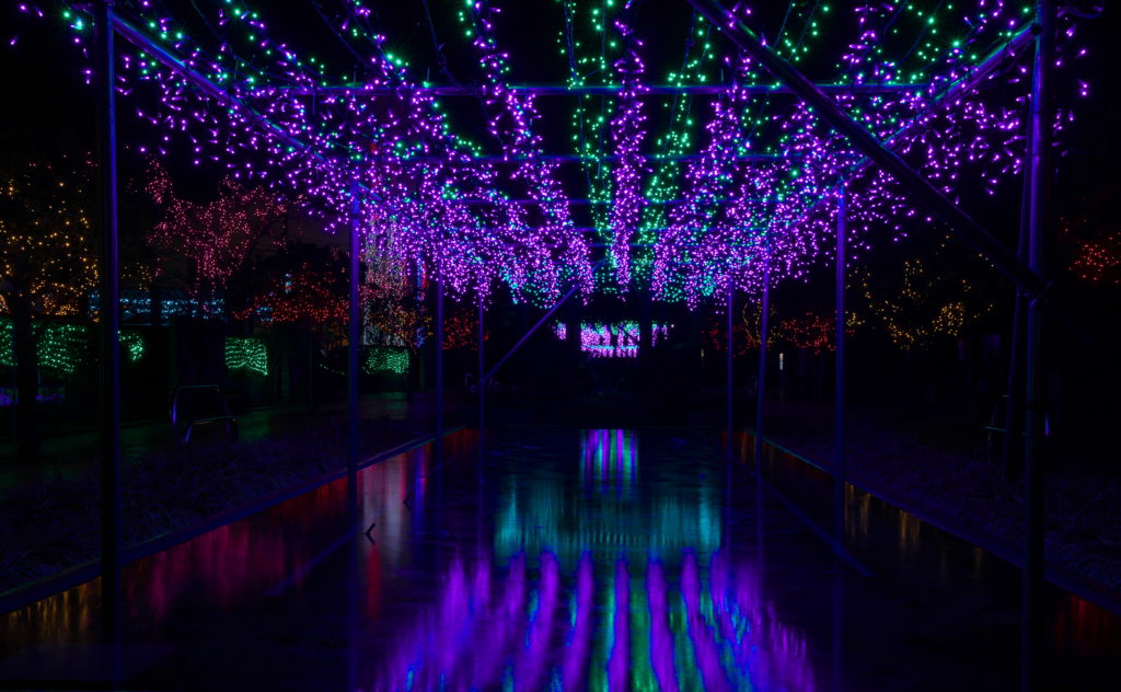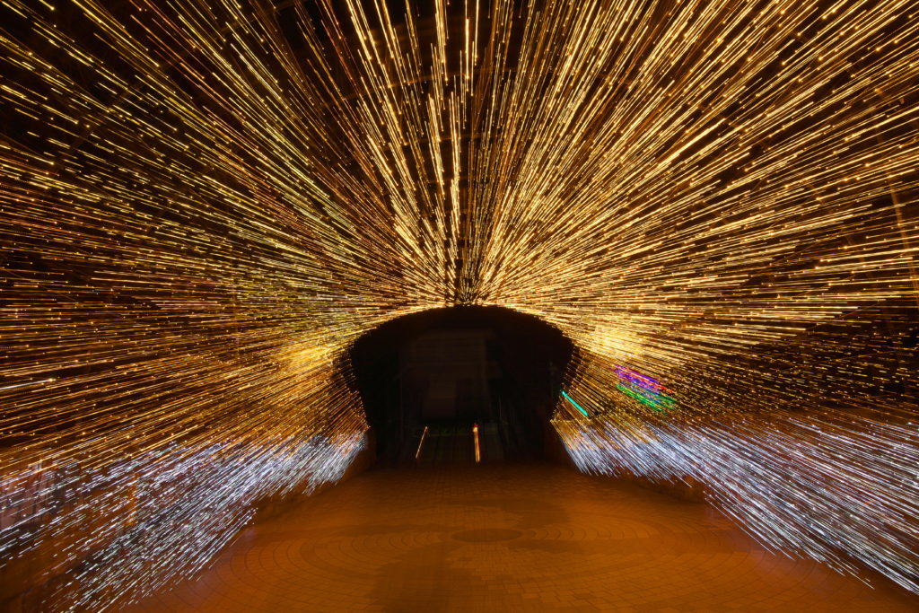 この写真は、イルミのトンネルでSS2秒で撮影、この2秒の間に広角から望遠へと意図的にレンズを動かしたらこうなった。