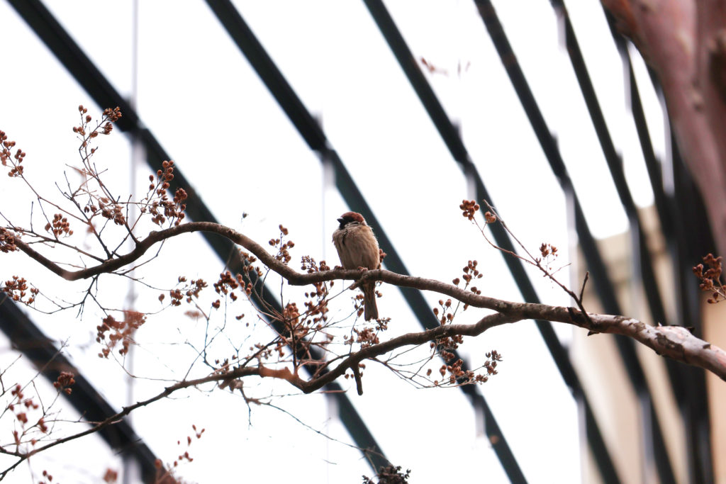 スズメがひとり「チュッチュ」と鳴いていて、レンズを向けても逃げる様子がない。