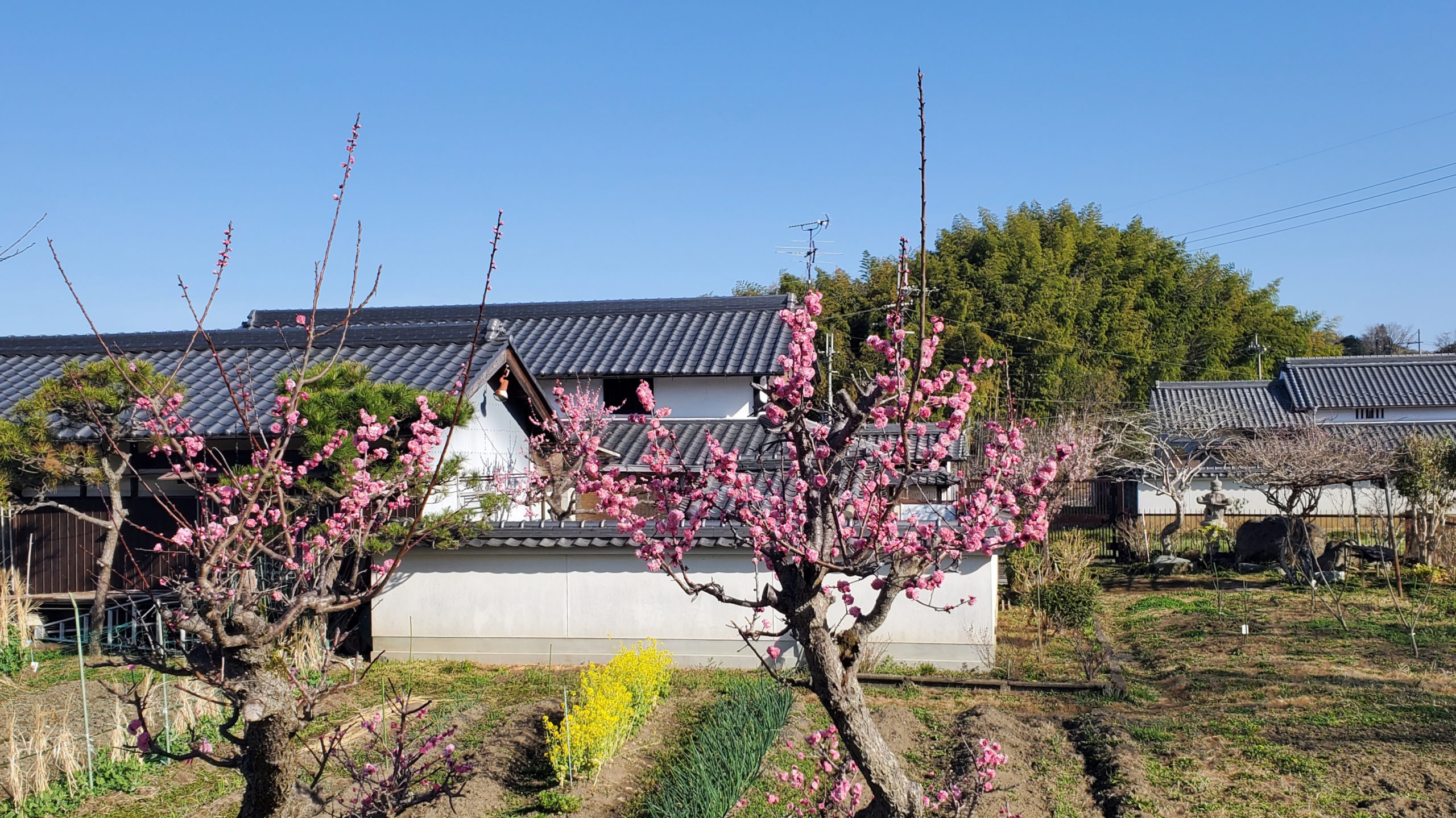 広々としたところに、古い建物、山の緑、野の花、鳥の声、遠景・・・。