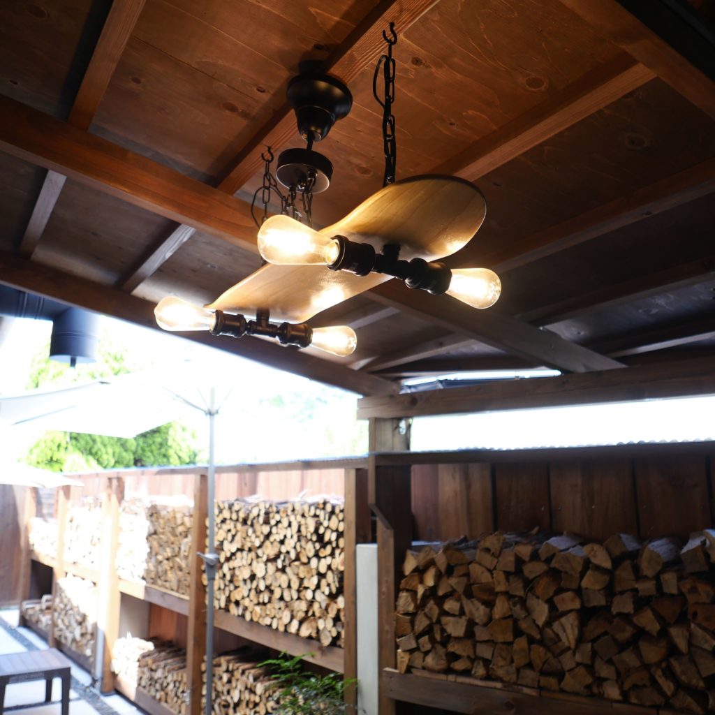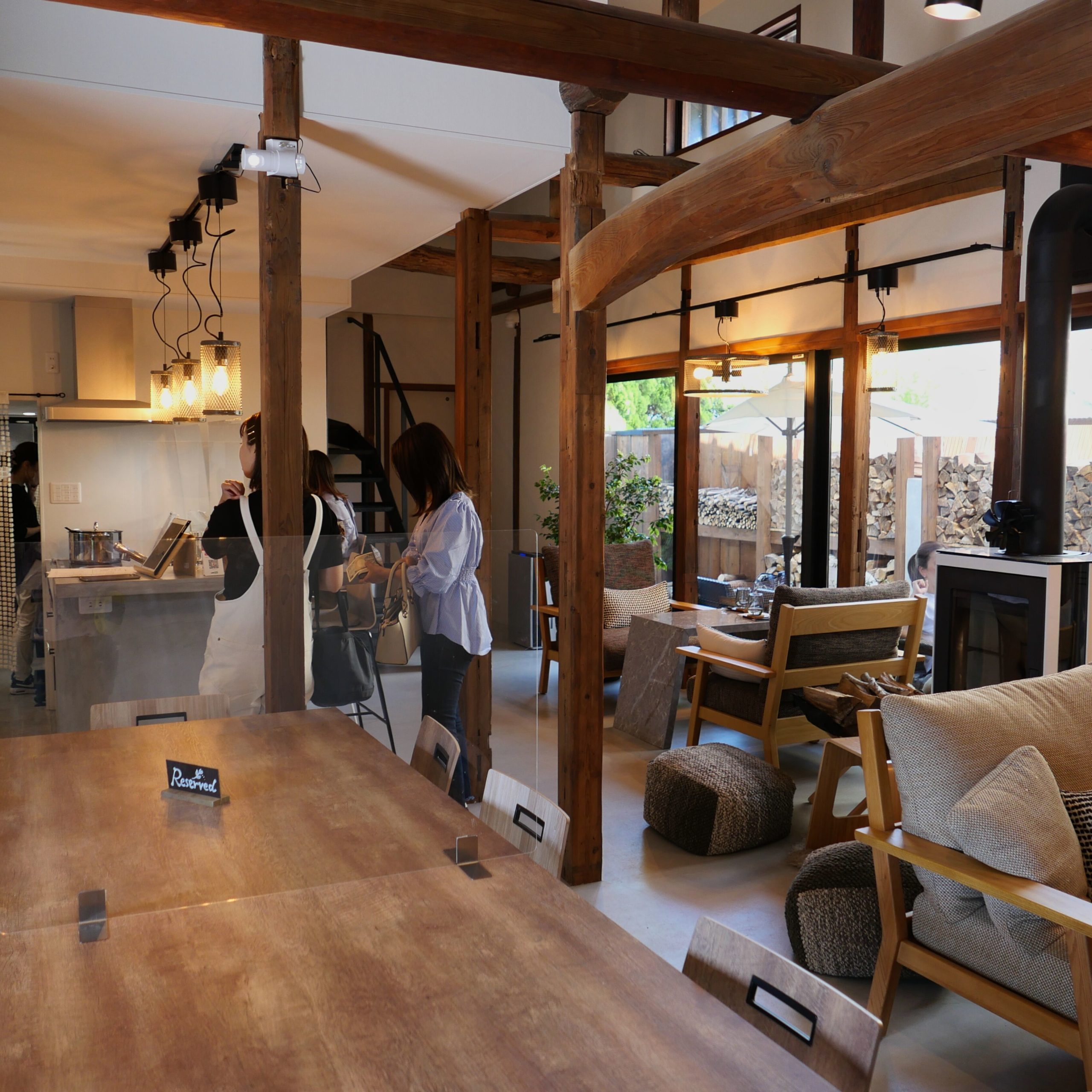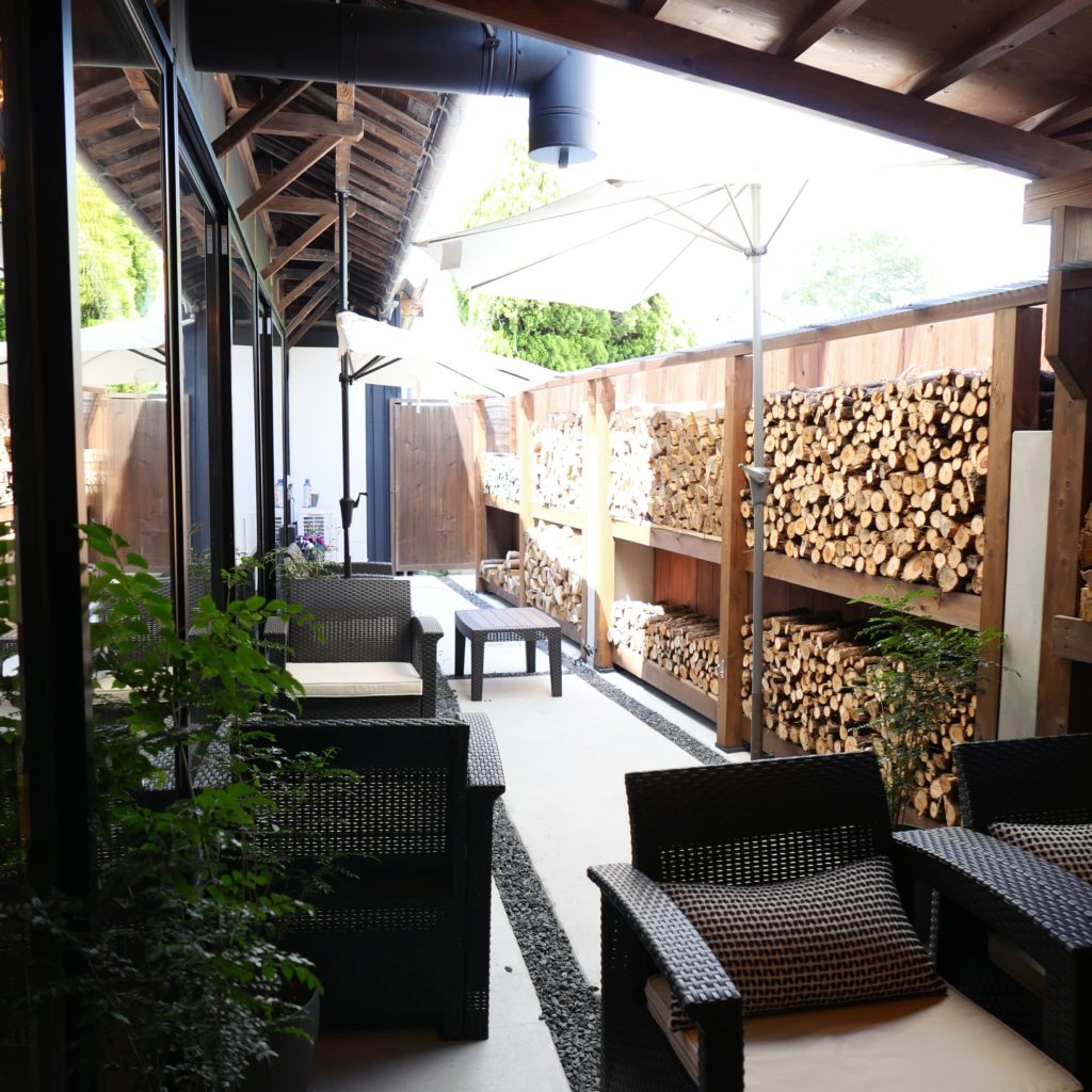 店内は清潔で明るく、薪ストーブが中央に設置され、テラスに薪が所狭しと並べられていた。