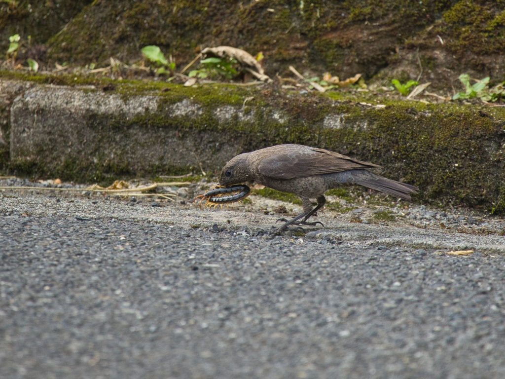 イソヒヨドリ(♀)×ムカデ Bird 2023.06.18 早朝ウォークで。大きなムカデは、目を避けたい。このときはイソヒヨドリが何と格闘しているのわからなかったのだが・・・。 シャッタースピードが追いつかず、ピントもずれて、まだまだ未熟を痛感。