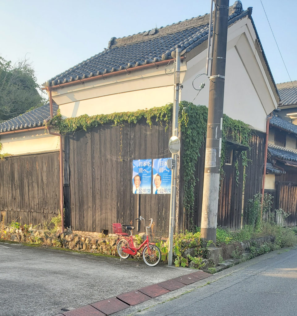 自転車の上に現在は与党に属する政党のポスター。