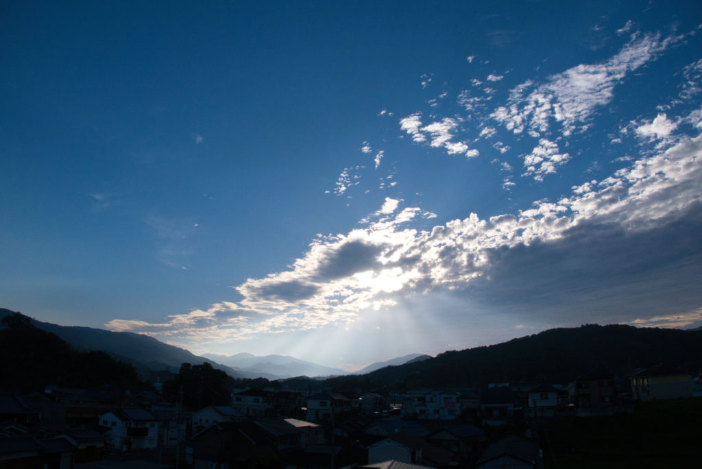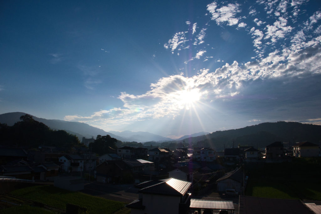 母校の桜井小学校の坂上の正門前からの定点観測は、長谷、榛原あたりの山間に光が降り注いでいた。
