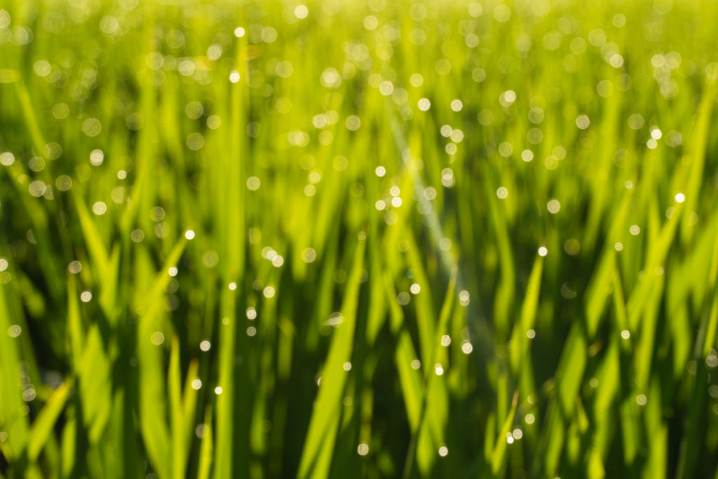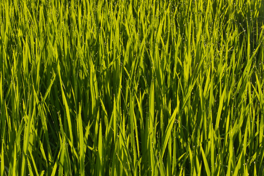 稲の葉は撥水性にすぐれているのか、朝日を目の方向にすると、水滴が輝く。