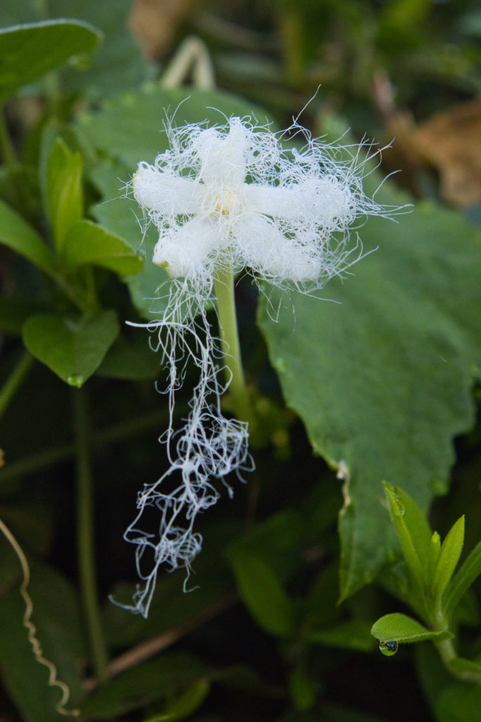 これは何という花なのか、はじめはクモの糸かと思ったが・・・、安倍文珠院でひっそり2輪咲いていた。後でGoogleレンズで調べると、カラスウリと呼ぶらしい。日が暮れてから咲きはじめ、朝にはしぼんでしまうそうなので、ラッキー!