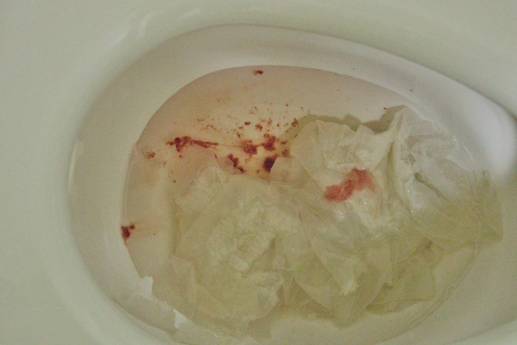 朝を迎えたところで、軟便がでそうになったので、便所に行くと、便は出ずに粘液に鮮血が混ざっていたのでビックリ!