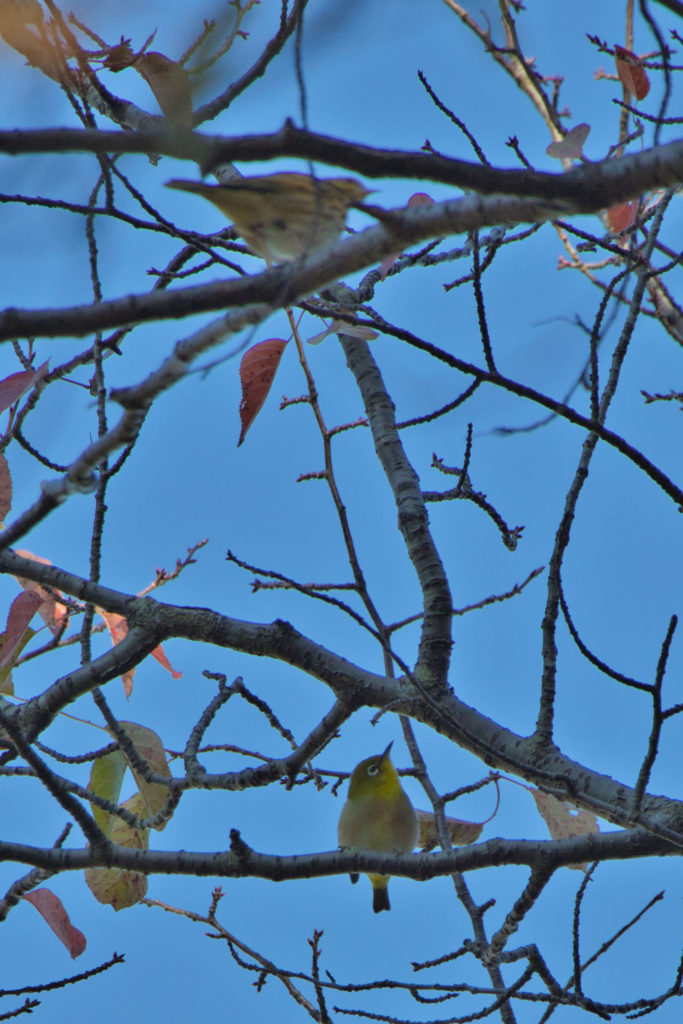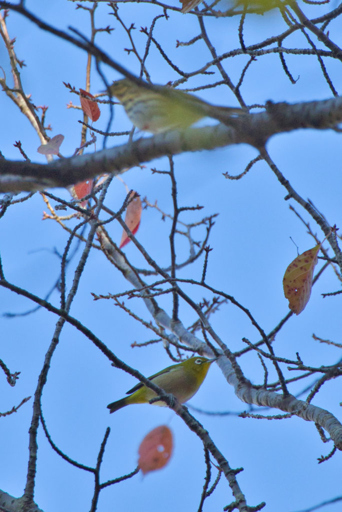 メジロは群れで行動するので、てっきり上部の鳥もメジロだと思っていた。必要以上にフォーカスしなかったのが残念。