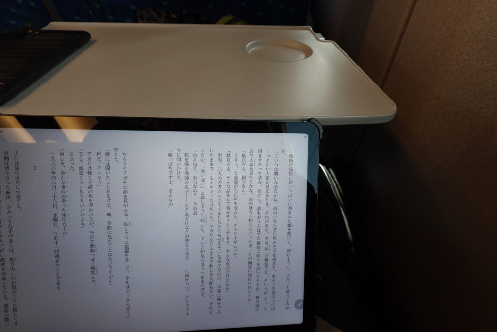 ヒザにはタブレットを乗せていて、『十角館の殺人』を読んでいる。