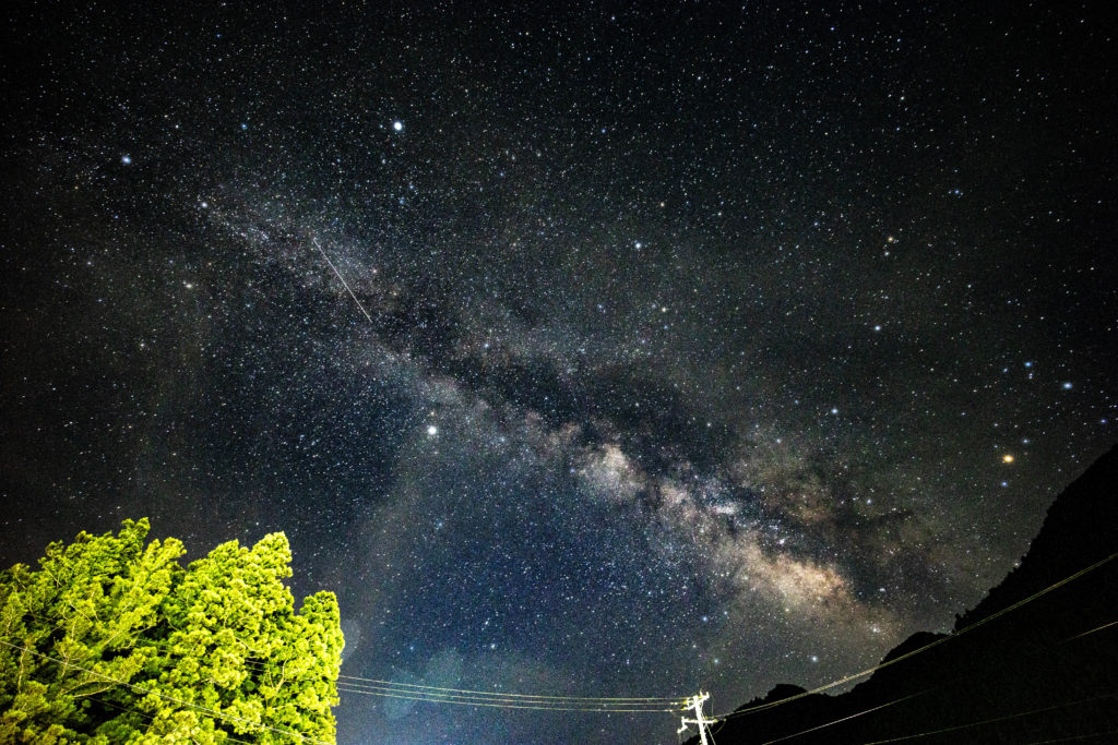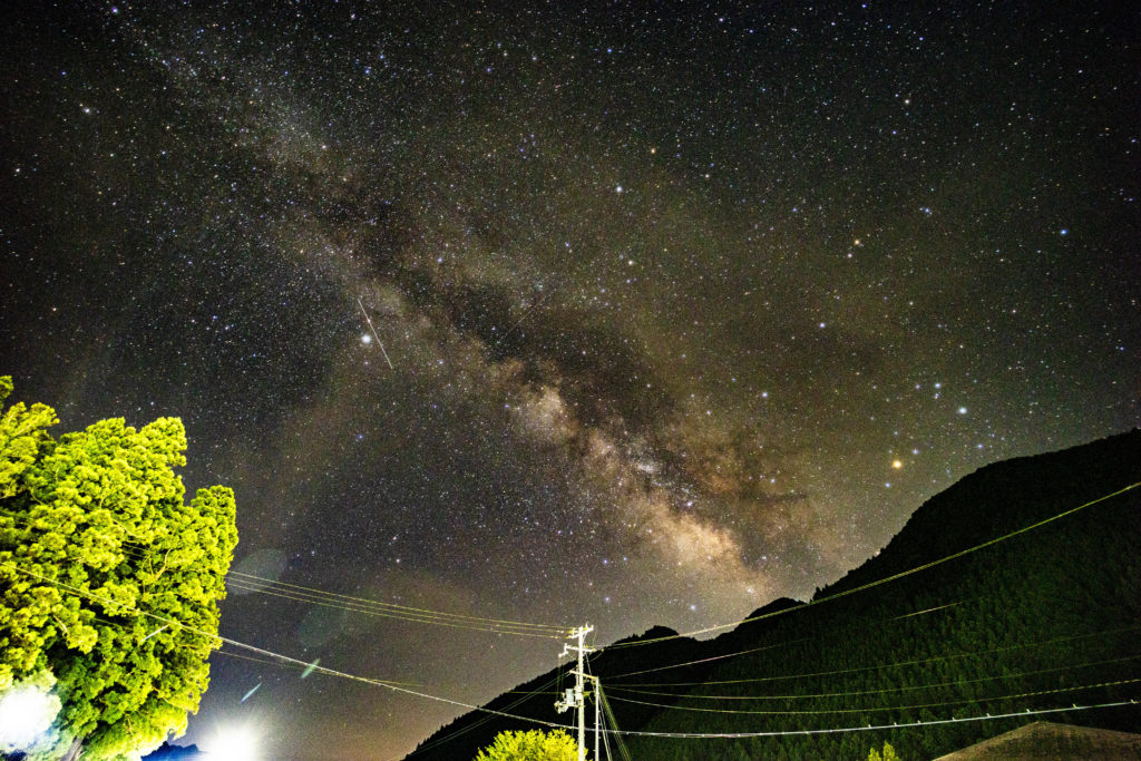 おくとろ温泉は、観光としての筏流しの拠点であり、観光やアウトドアを楽しむ人が、温泉や宿泊、キャンプ等で集うランドマーク。結構明るいが、それでも前を走る国道からは夜空を狙うとそれなりに天の川を撮影することができる。