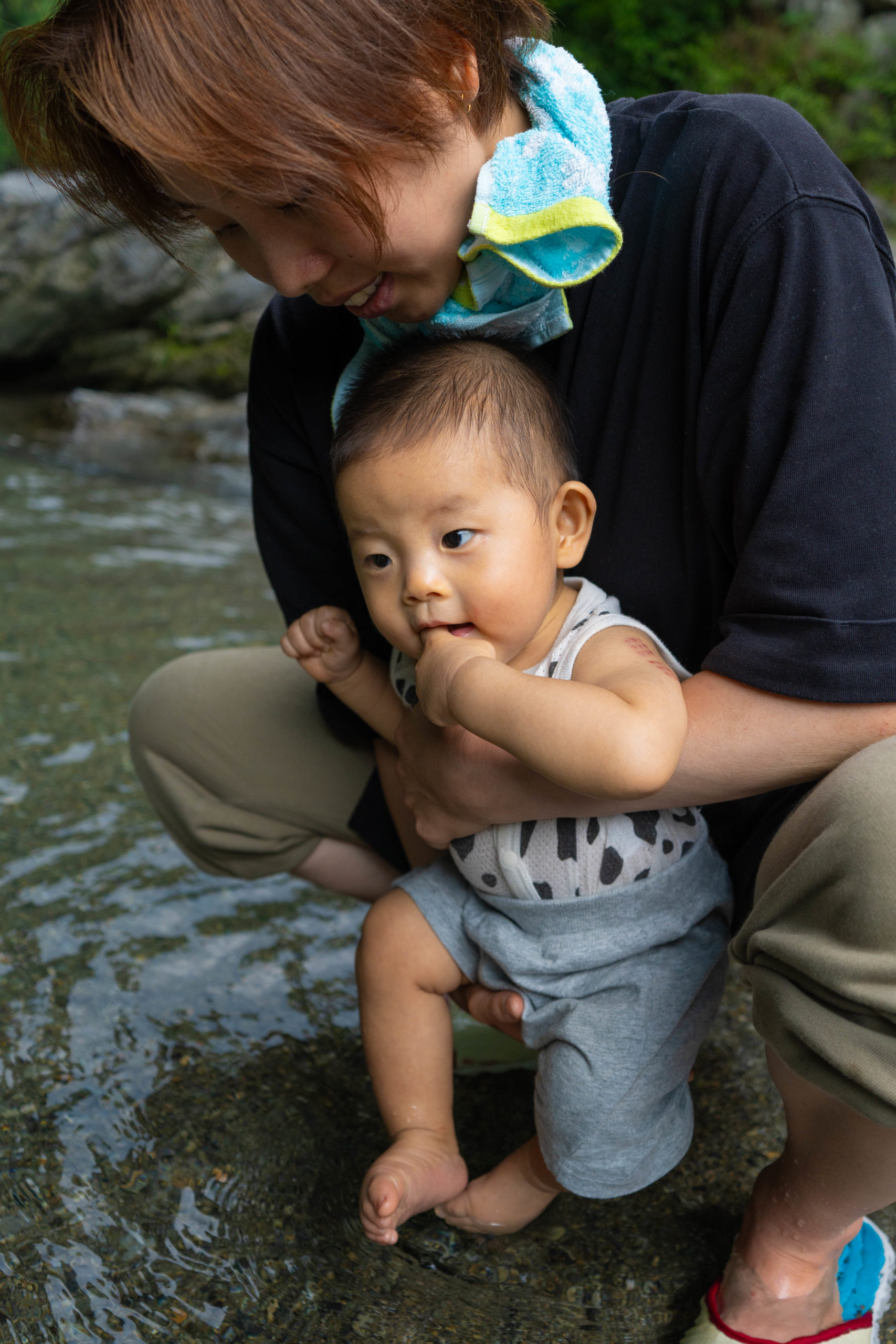 Eat遠雷が聞こえる中、東吉野村「やはた温泉」のすぐそばを流れる川で、ビック娘とミドル娘の子どもたちと川遊び。