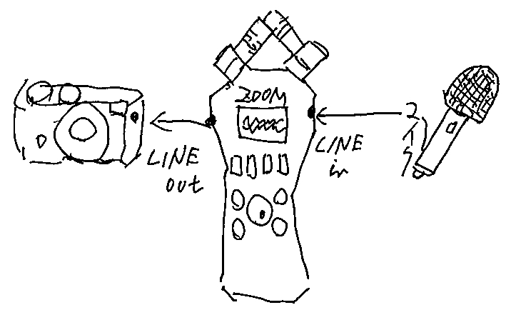 ①カメラ内臓マイク、②カメラ接続マイク(H1essential)