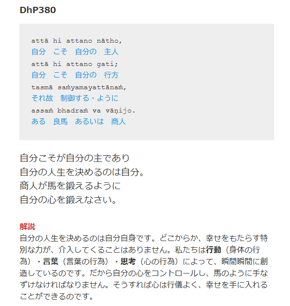 ネットで拾った情報によると、ゴーダマ・ブッダの教えを簡潔な言葉にしてまとめた名言集なのだそうで、「ダンマ」は真理、パダは歩みを意味し、直訳すれば「真理(ブッダ)の歩み」となるらしい。
