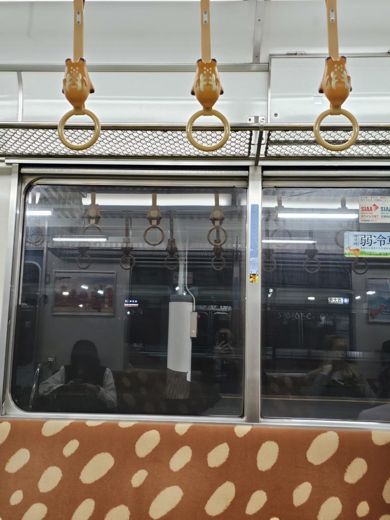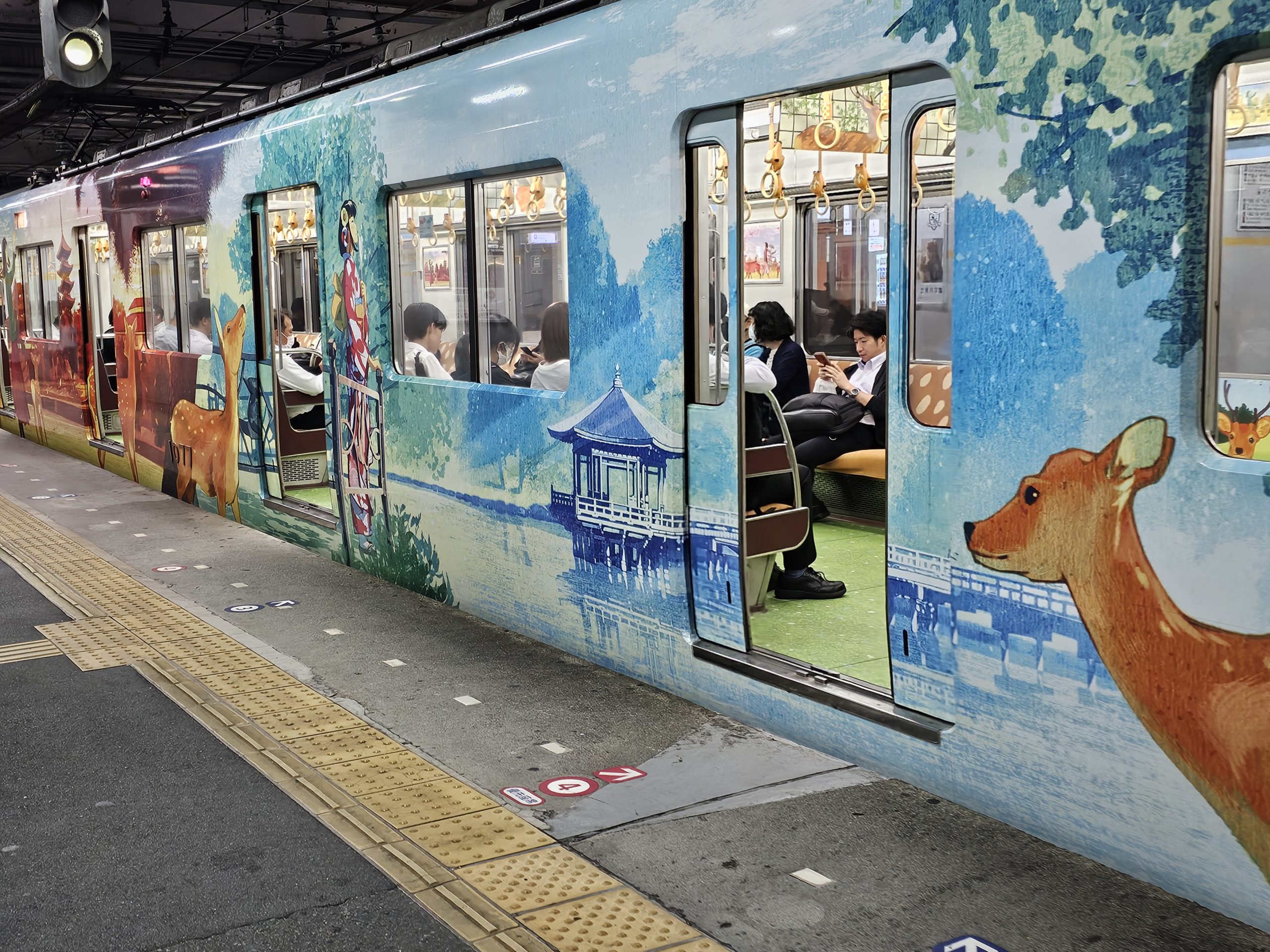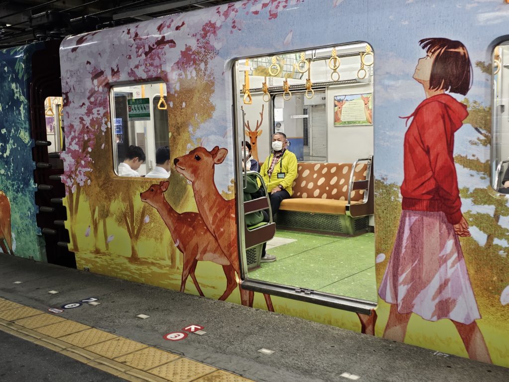 奈良づくし、鹿づくしの近鉄電車 Business 2024.10.25 昨日は千里まで出張し、同僚に古市駅まで送ってもらい、南大阪線から橿原神宮前、大和八木駅と乗り換えた。橿原神宮前駅からは、奈良づくし、鹿づくしの電車に乗ることになった。 床は若草山や奈良公園をイメージしてか、一面緑だった。