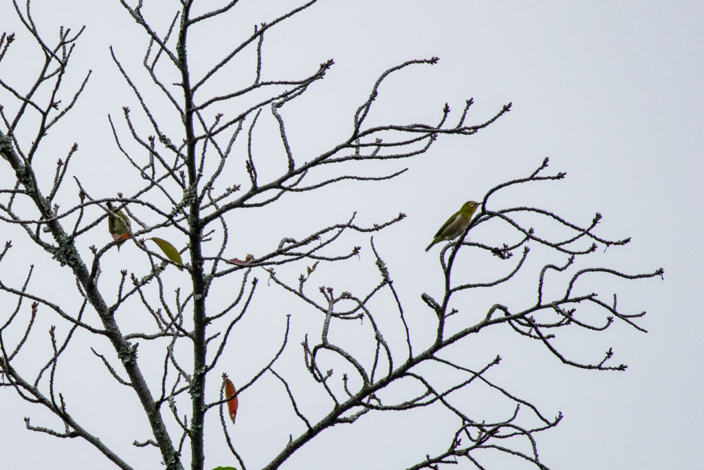 ここでも鳥を見かけないので、早々に下山したところで、メジロ。