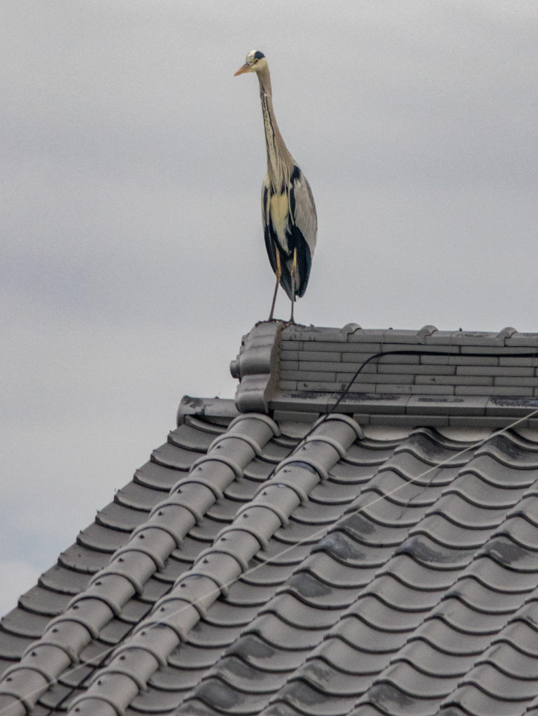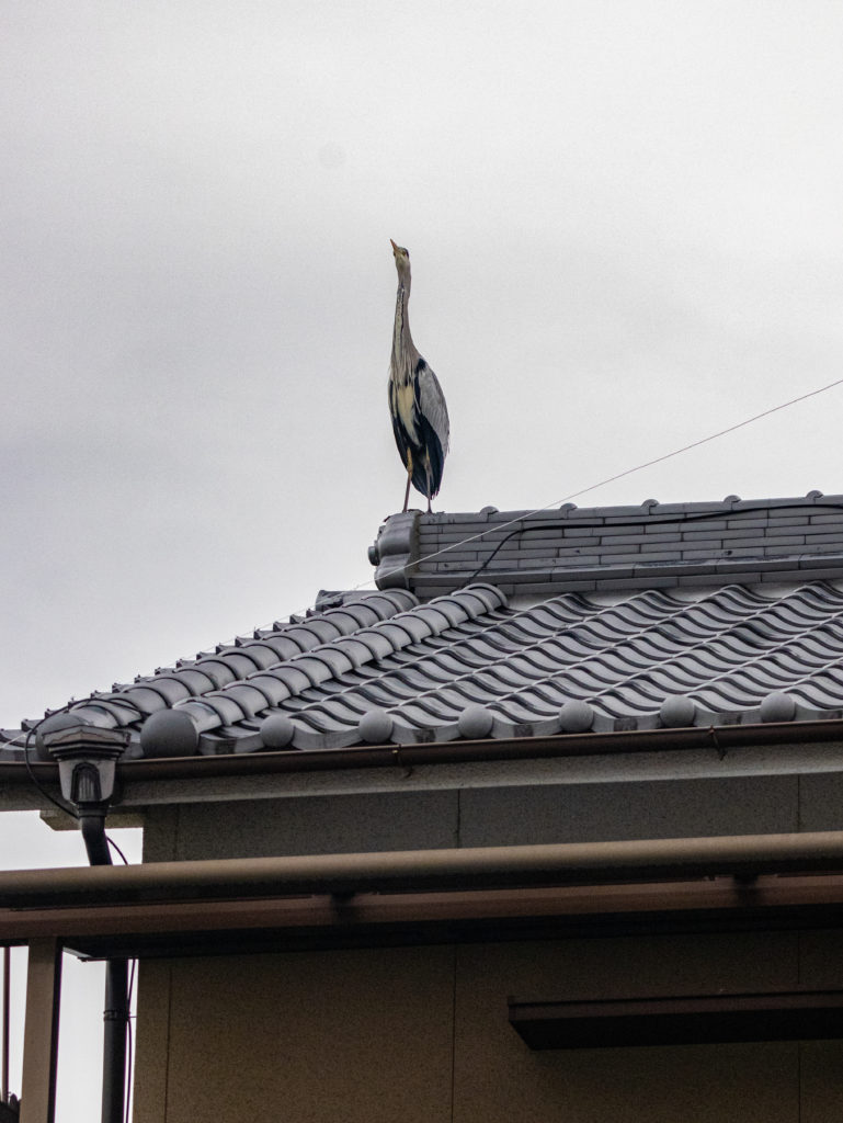 屋根に建っているのはアンテナ?と思ってみたが、アオサギだった。