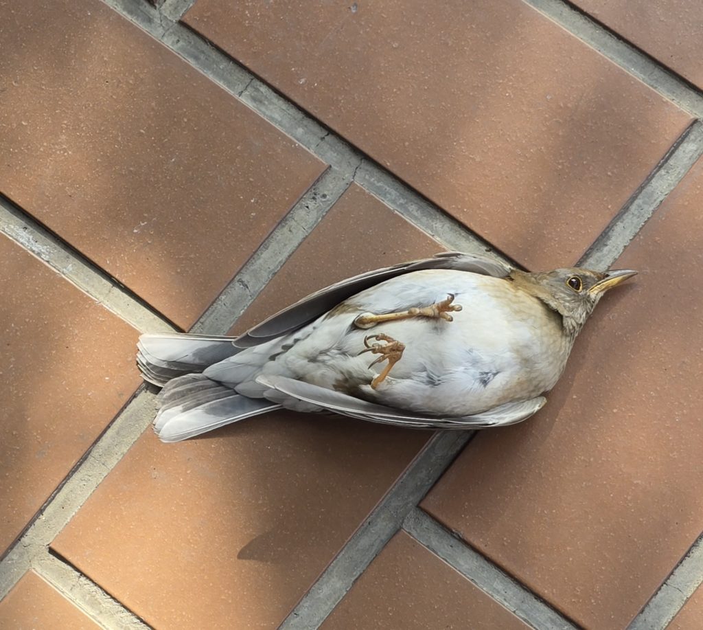 施設の建物、特に反射性の強いガラスにぶつかったのだろうか。