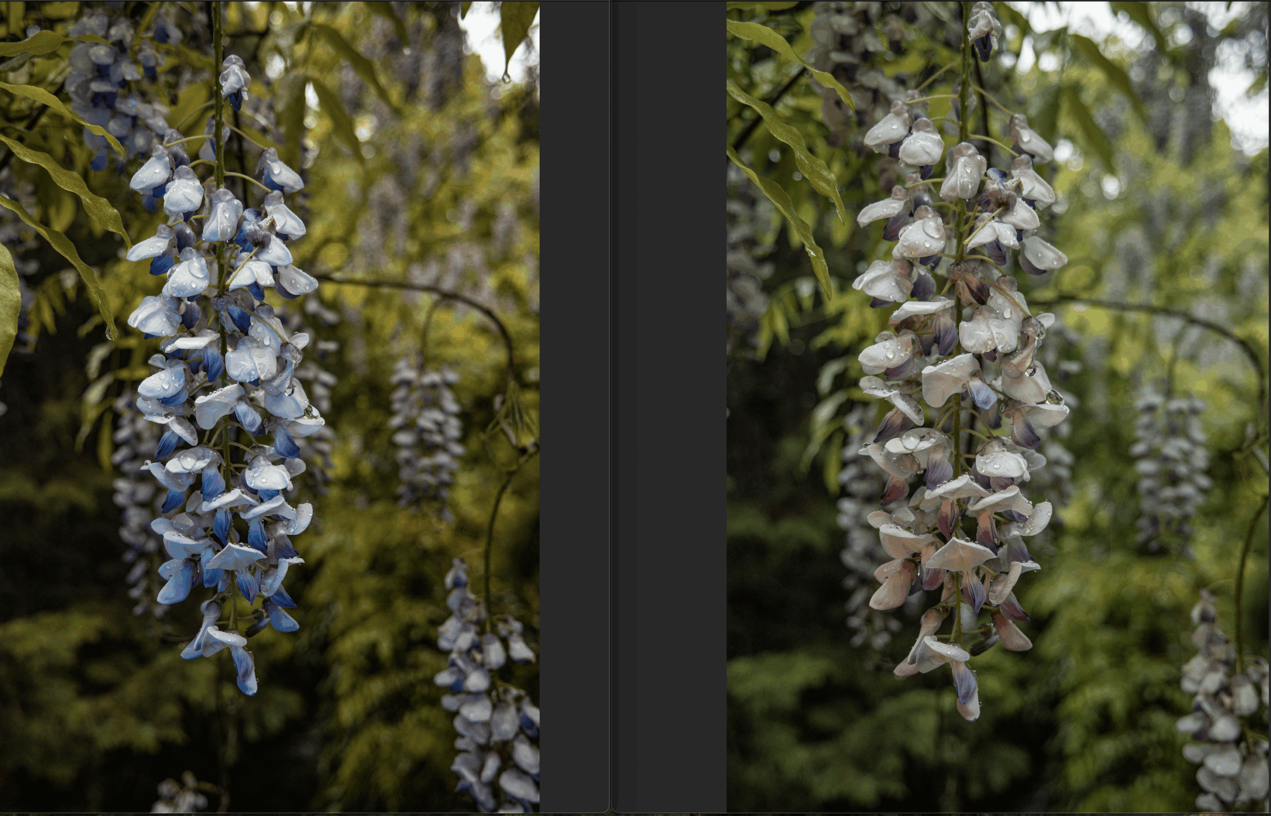 Ulanzi LEDビデオライトで色温度を変えてみた PowerShotV1 2025.05.06 全然違うやん。左は青、右は赤に照明に違いを持たせた。左は藤らしい色になるが、背景の緑が黃ばんで見える。右は藤の色が抜けてしまっているが、背景の緑はきれいだ。照明にも勉強が必要だ