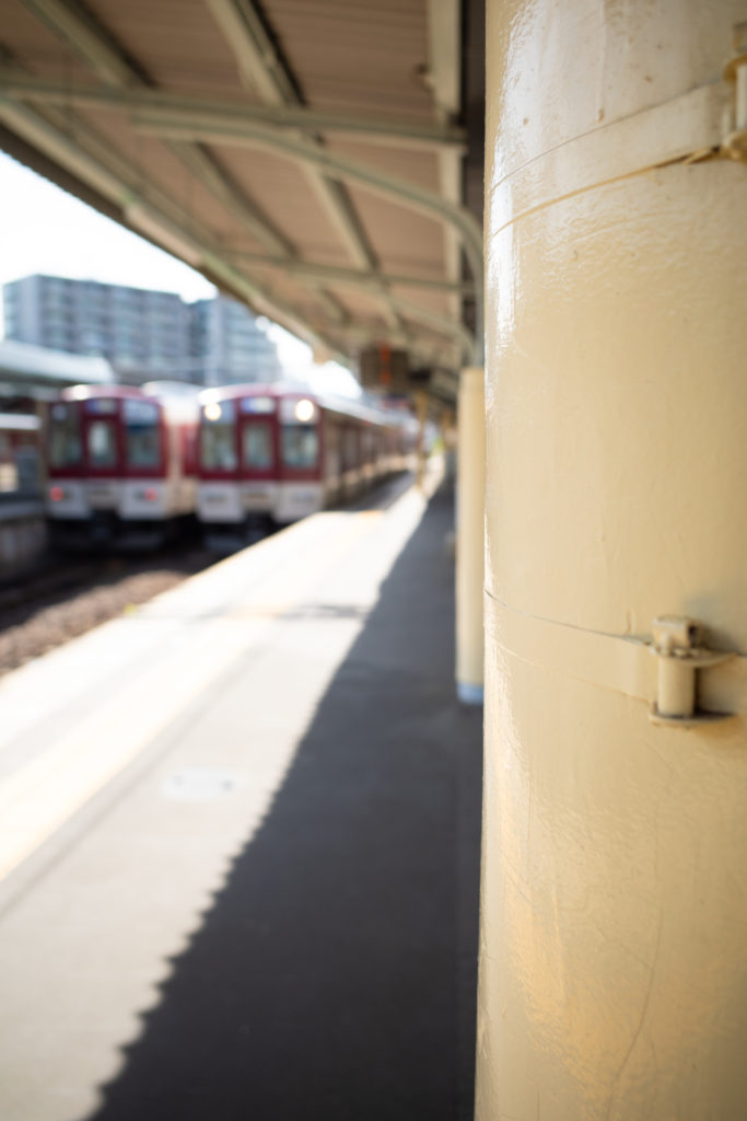 柱に焦点をあてて電車をぼかしてみる。